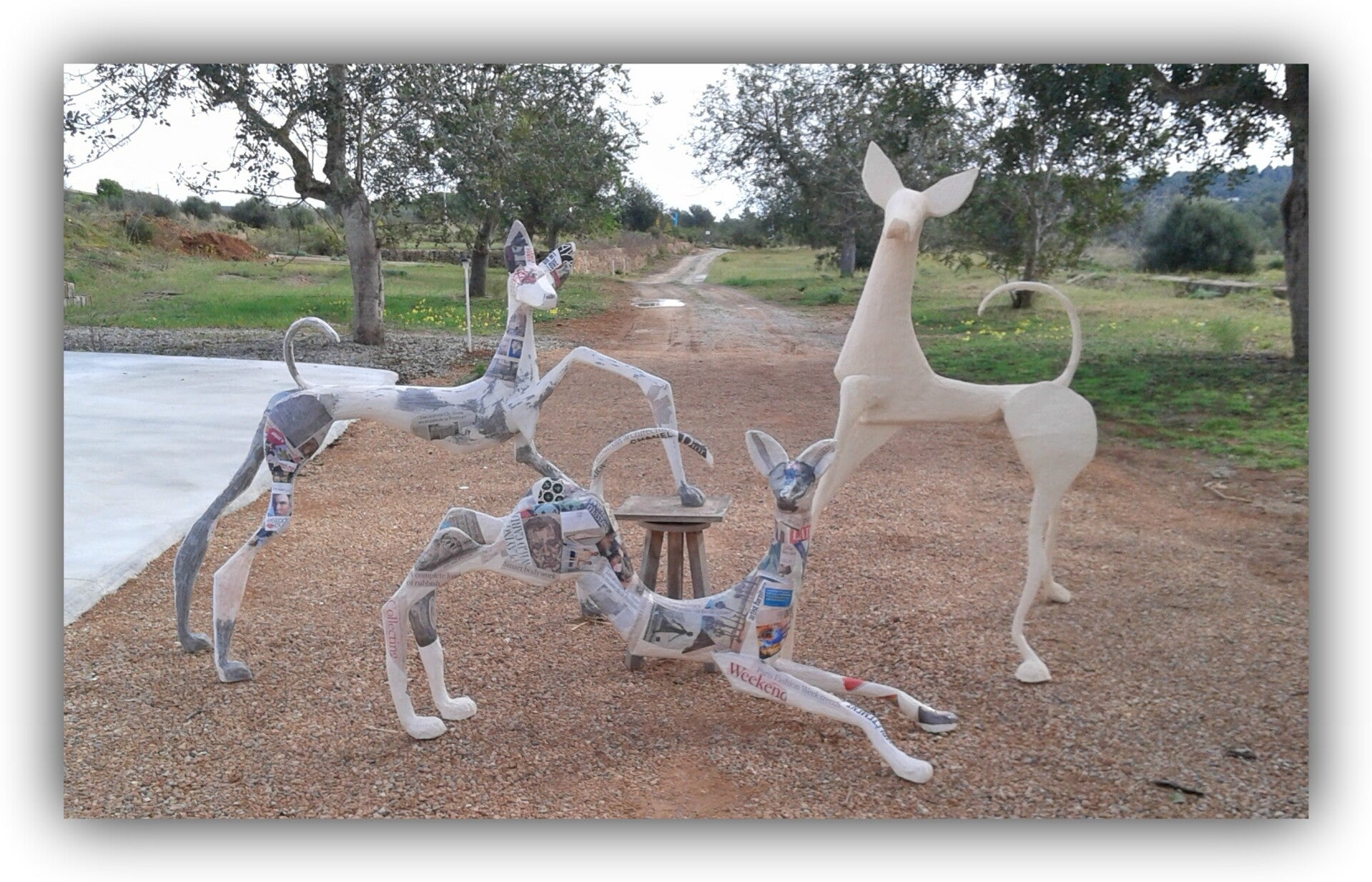 Three larger-than-life abstract Podenco figures in different stances. Made in fibreglass, resin, and mixed media.