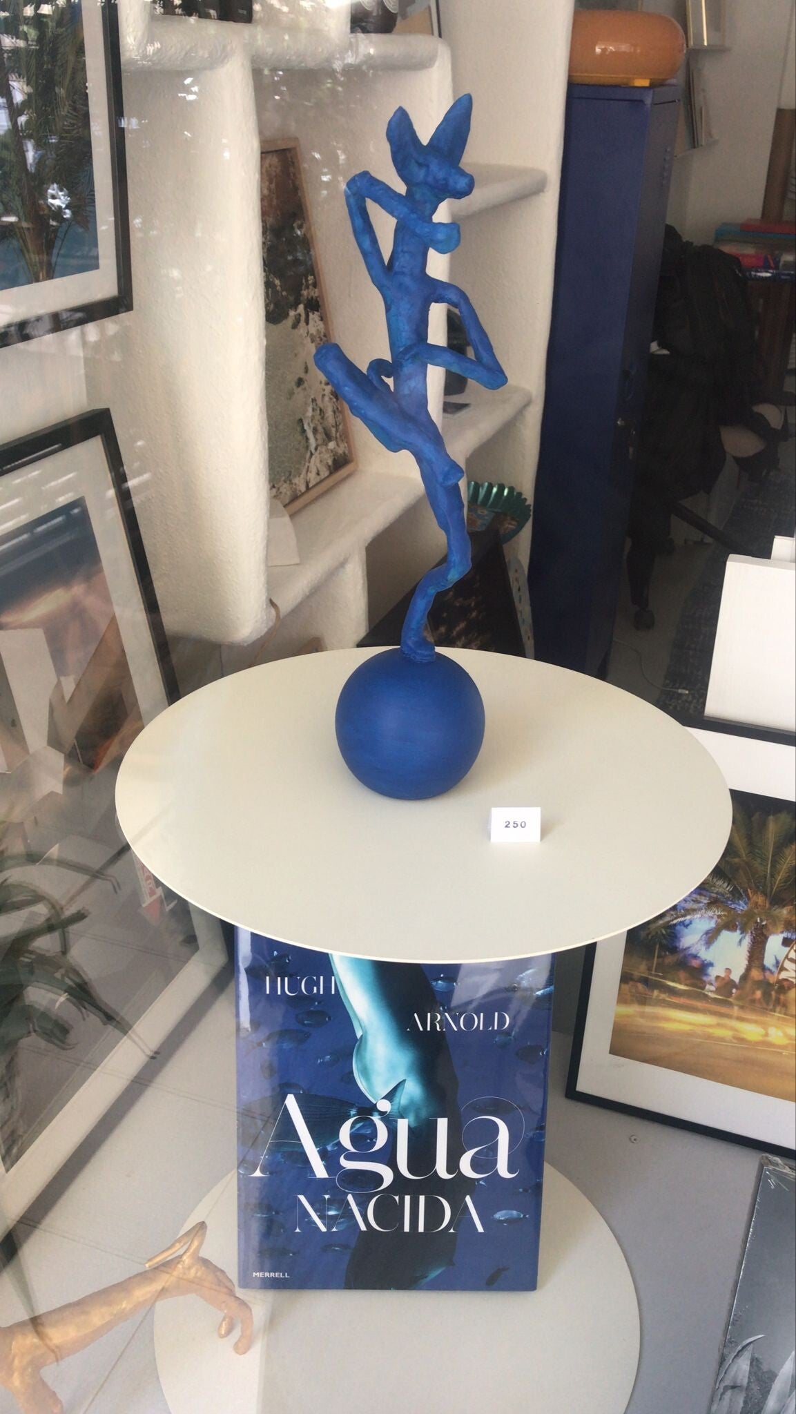 A resin Podenco sculpture in a classical ballet pose. The figure has a human-like stance, but it’s still clearly a Podenco. It’s finished in the blue of Ibiza and stands about 40 cm tall.